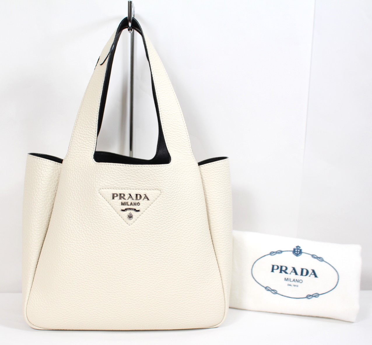 プラダのスモールレザ-トートバッグは、上質なヴィッテロダイノレザーを使用した、現行ラインでも高い人気を誇るモデルです。傷が目立ちにくく、柔らかさと耐久性を兼ね備えた素材は、日常使いでも美しい状態を保ちやすい点が支持されています。シンプルで洗練されたデザインは流行に左右されず、ビジネスからカジュアルまで幅広いシーンに馴染むのも魅力です。さらに、収納力と軽さのバランスが良く、使い勝手の高さも人気の理由のひとつ。長く愛用できる実用性と、PRADAならではの上品さを兼ね備え、多くのお客様から選ばれ続けている定番モデルです。
